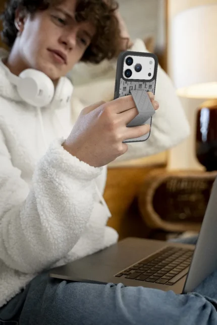 غطاء حماية ايفون17 برو مع حاملة بطاقات وحزام مغناطيسي للتثبيت / قبضة بيد واحدةوغطاء خلفي بتصميم فاخر مع شعار مطبوع باللون الرمادي