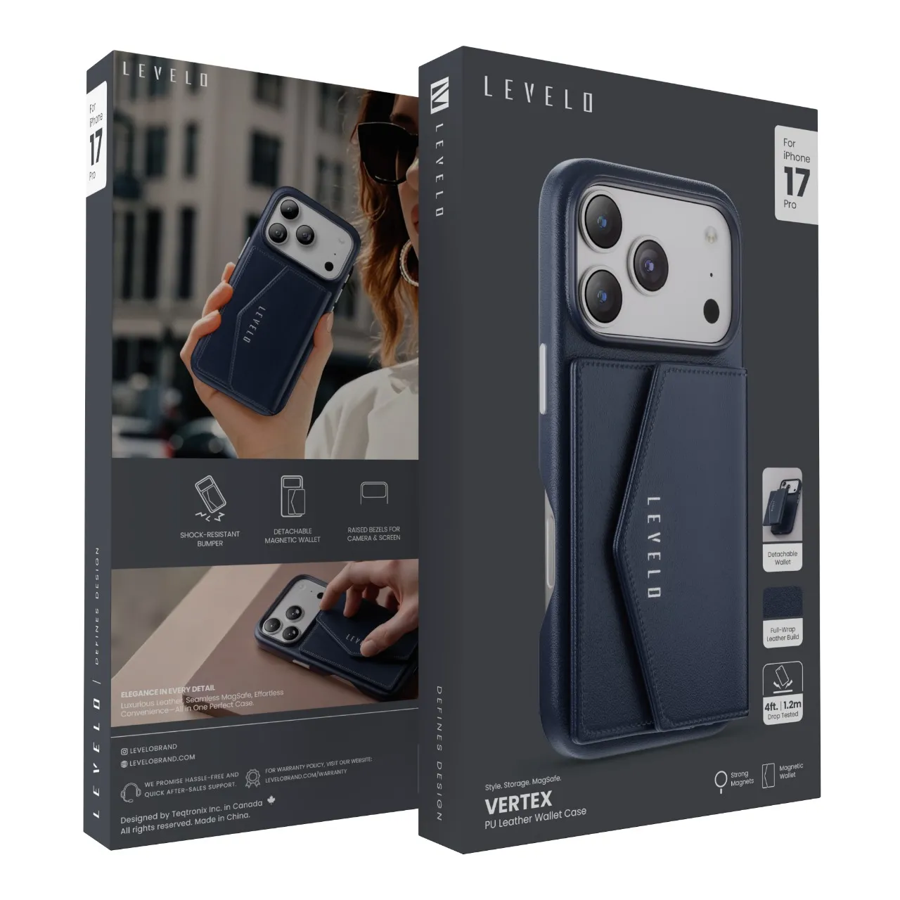 باللون الأزرق- MagSafe غطاء حماية لهاتف ايفون 17بروماكس مصنوع من الجلد الصناعي مع محفظة مغناطيسية قابلة للفصل متوافق مع