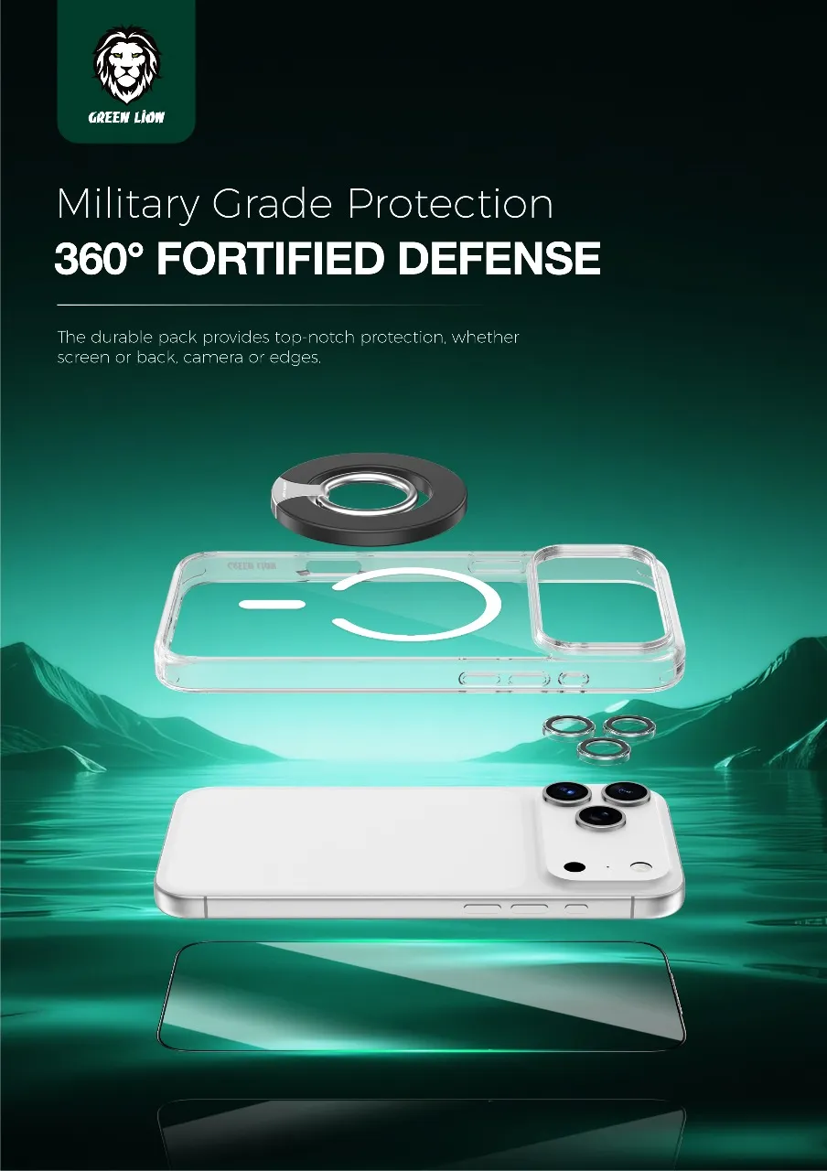 صُممت مجموعة Green Lion 4 In-1 Defender Pack لحماية جهازك بالكامل. تتضمن هذه المجموعة غطاءً مقاومًا للصدمات، شفافًا تمامًا مع حماية شاملة بزاوية 360 درجة للهاتف. يتميز الغطاء بتقنية مقاومة الاصفرار، مما يجعله دائمًا جديدًا، بالإضافة إلى تقنية nano HD للحماية الكاملة، وهو متين. كما يحتوي على طبقة واقية عالية الدقة مضادة للانعكاس لحماية عدسة الكاميرا، بالإضافة إلى زجاج PET ثلاثي الأبعاد عالي الدقة يمنع الخدوش وبصمات الأصابع والحواف المكسورة. توفر هذه المجموعة أقصى حماية ووضوحًا عالي الدقة للحفاظ على هاتفك آمنًا من التلف الناتج عن الاستخدام اليومي، وذلك بتصميم أنيق وعصري.