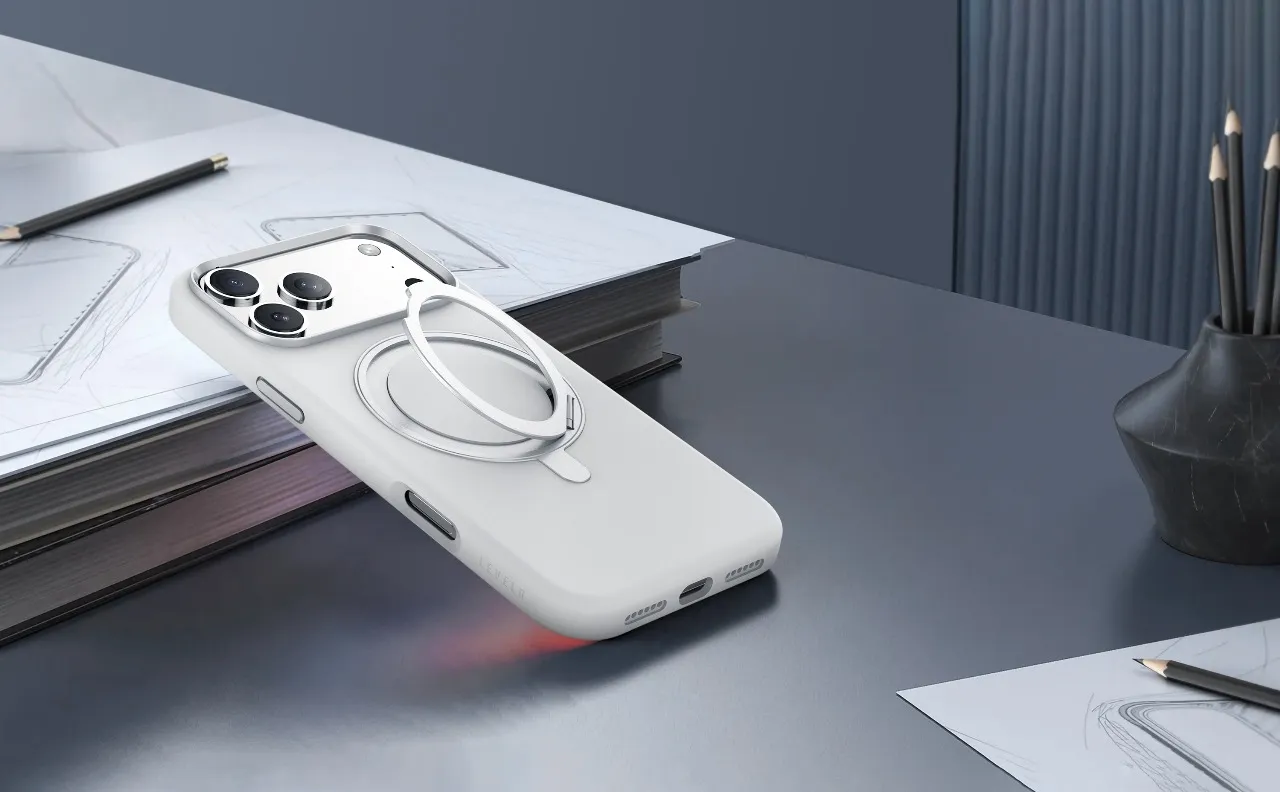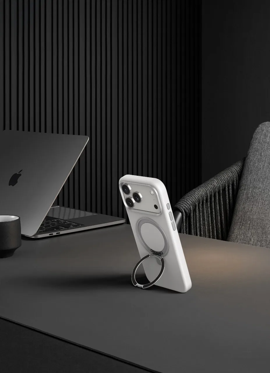 غطاء حماية آيفون 17 برو سيليكون ليكويد ايريس برو مع حامل مدمج وحلقة كاميرا معدنية من مادة هجينة - باللون الفضي ر.س99.00
