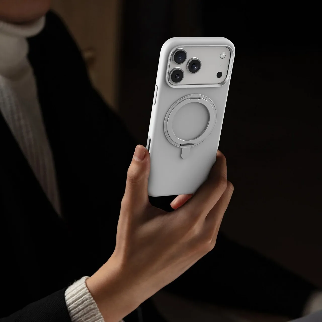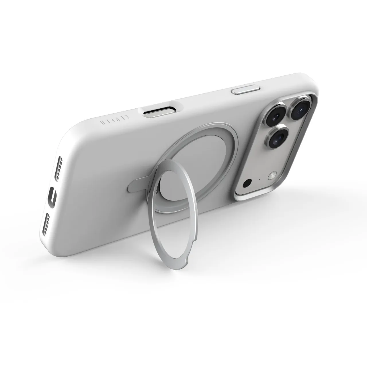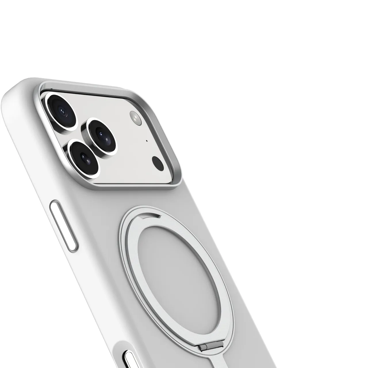 غطاء حماية آيفون 17 بروماكس سيليكون ليكويد ايريس برو مع حامل مدمج وحلقة كاميرا معدنية من مادة هجينة – باللون الفضي