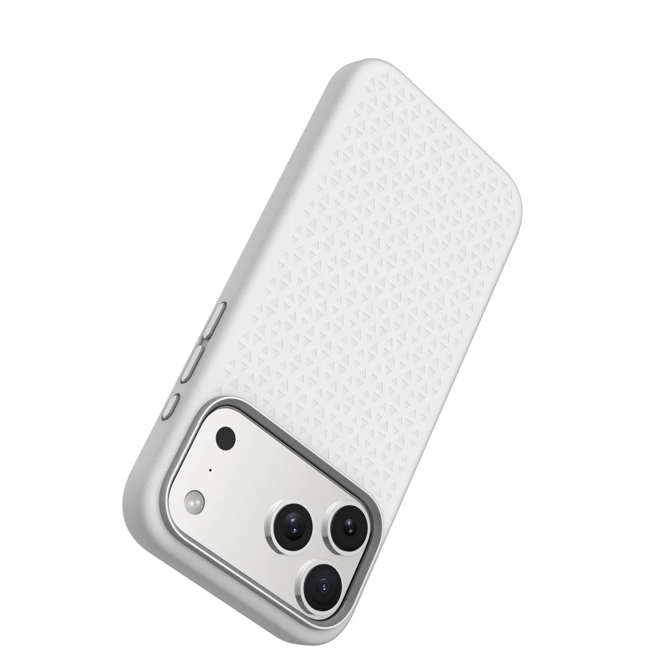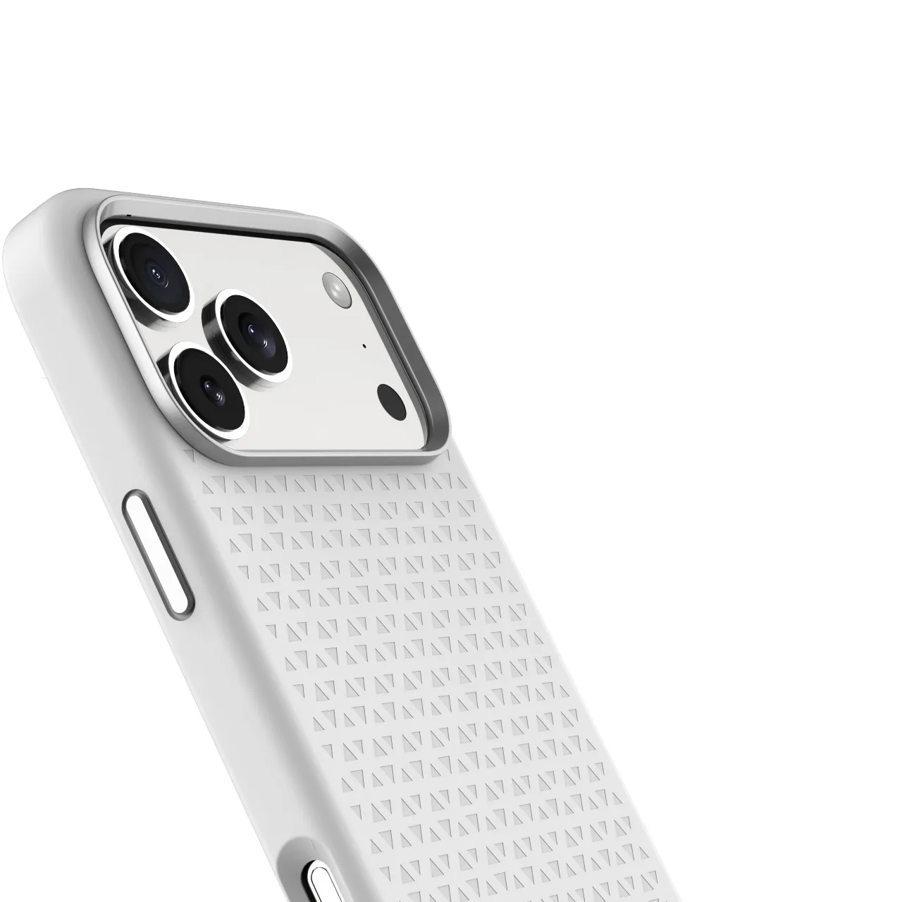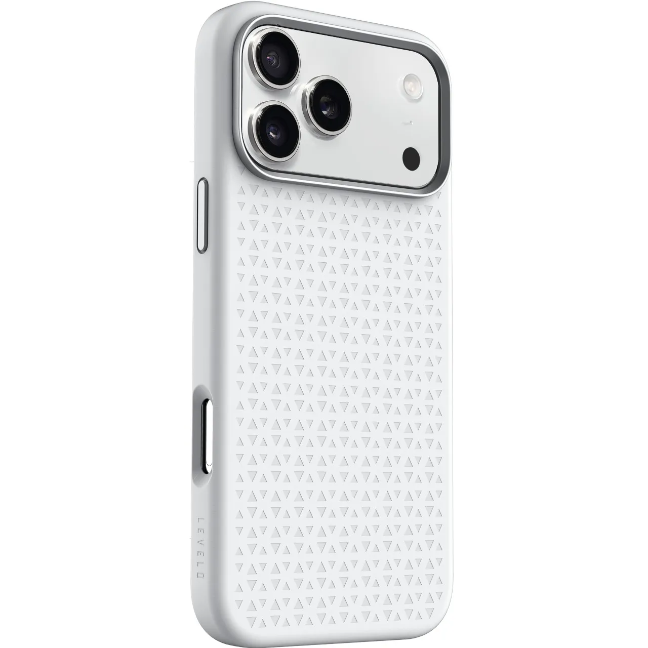 غطاء حماية ايفون 17 برو فيورا ماج سيف المصنوع من السيليكون السائل بتصميم منقوش / إطار من سبائك الألومنيوم للكاميرا والأزرار باللون الفضي المميز