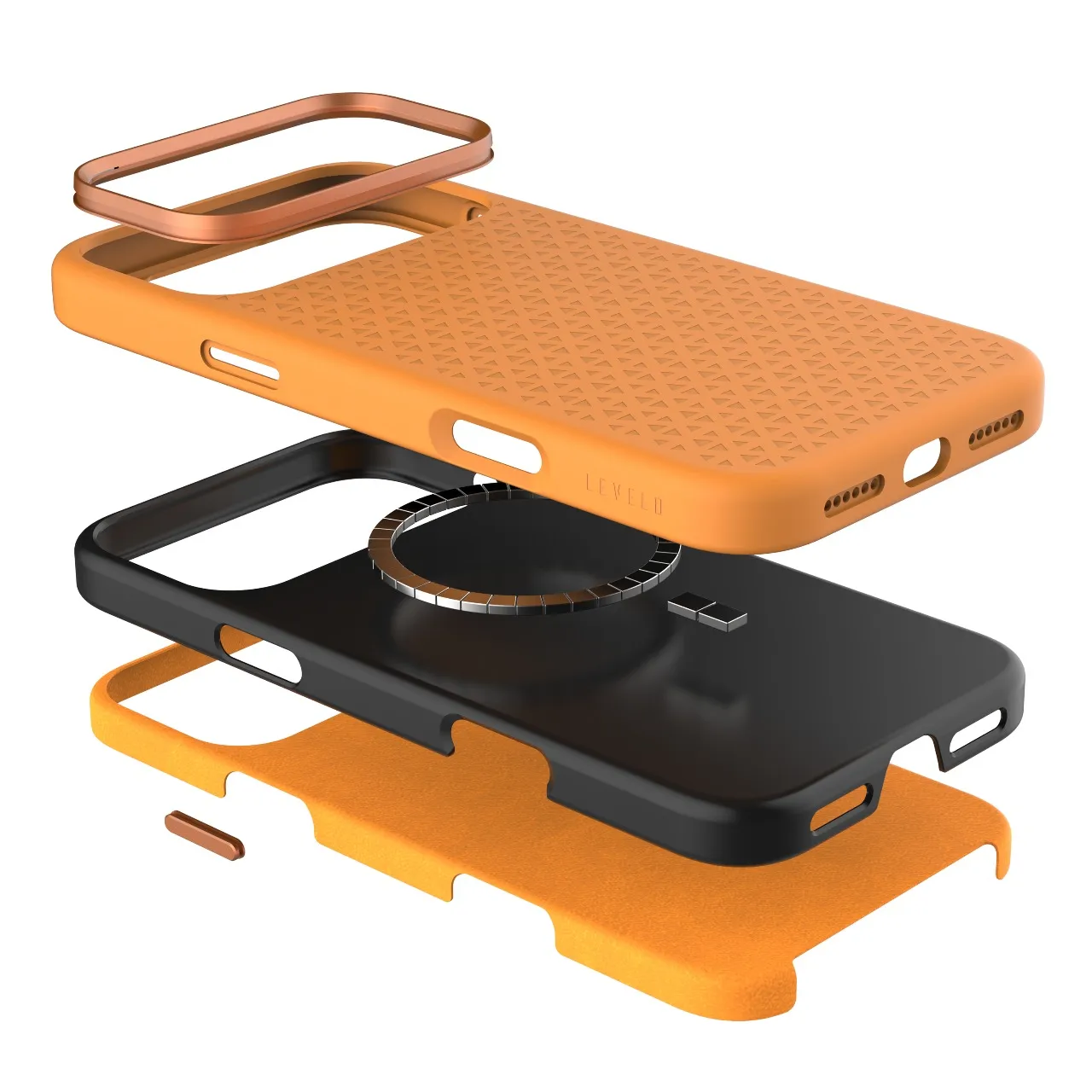 غطاء حماية ايفون 17 برو فيورا ماج سيف المصنوع من السيليكون السائل بتصميم منقوش / إطار من سبائك الألومنيوم للكاميرا والأزرار باللون البرتقالي المميز