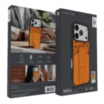 غطاء حماية ايفون17 برو مع حاملة بطاقات وحزام مغناطيسي للتثبيت / قبضة بيد واحدةوغطاء خلفي بتصميم فاخر مع شعار مطبوع باللون البرتقالي