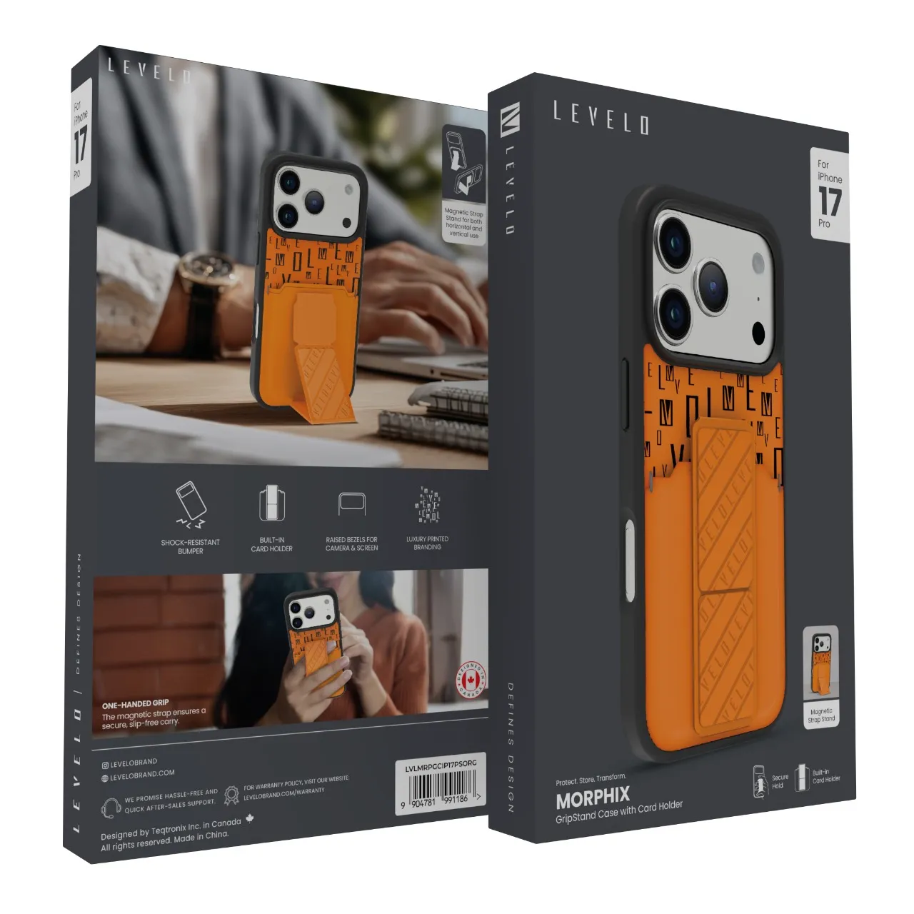 غطاء حماية ايفون17 بروماكس مع حاملة بطاقات وحزام مغناطيسي للتثبيت / قبضة بيد واحدةوغطاء خلفي بتصميم فاخر مع شعار مطبوع باللون البرتقالي