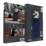 غطاء حماية ايفون17 بروماكس مع حاملة بطاقات وحزام مغناطيسي للتثبيت / قبضة بيد واحدةوغطاء خلفي بتصميم فاخر مع شعار مطبوع باللون الأزرق