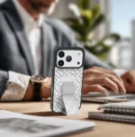 غطاء حماية لهاتف ايفون 17بروماكس شفاف مع حاملة معدنية دوارة باللون الفضي 360°