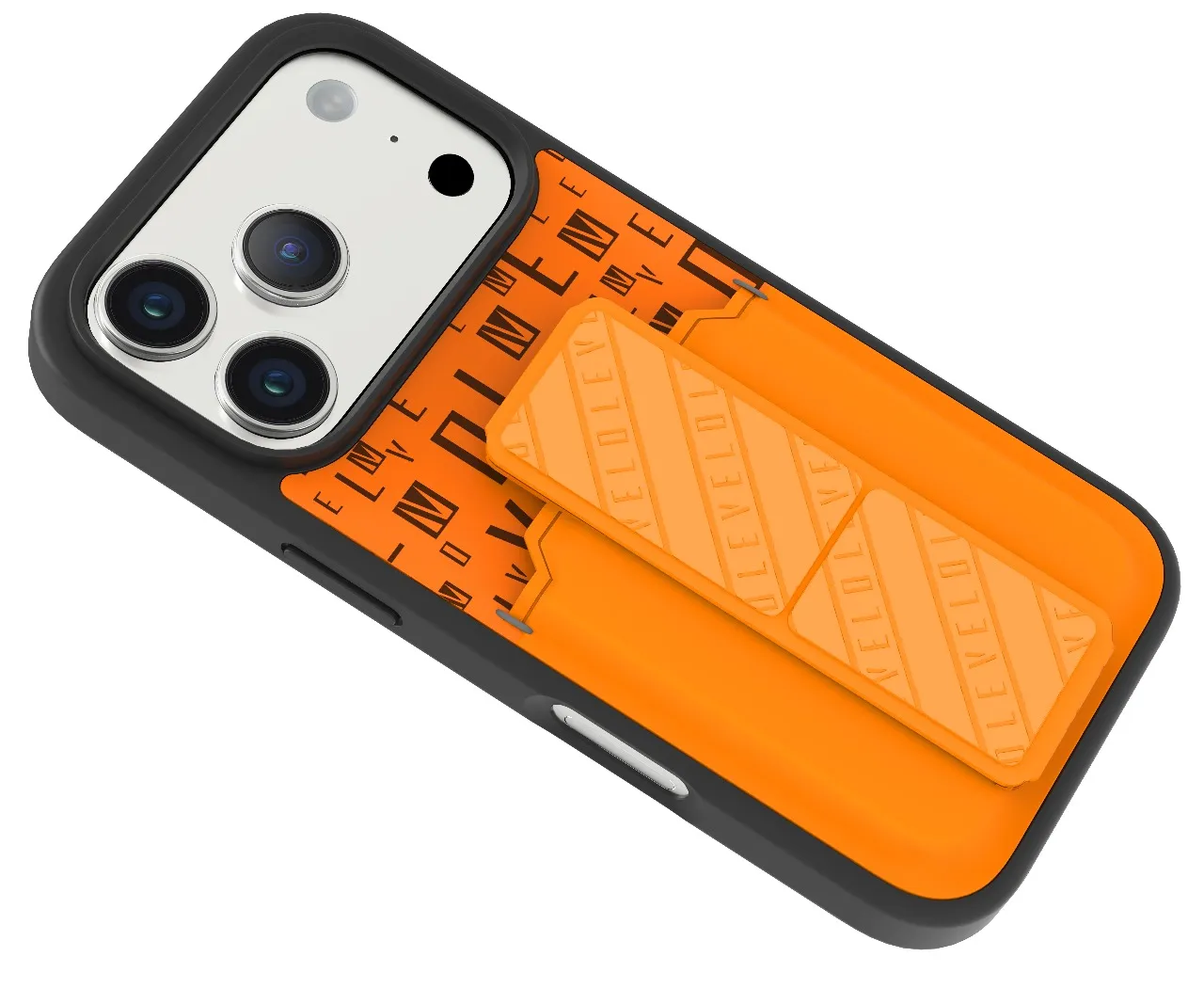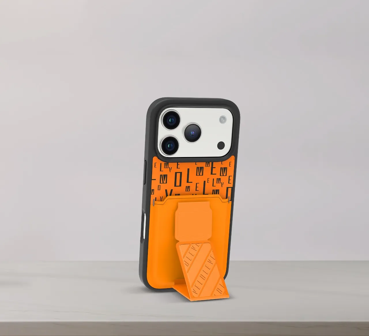 غطاء حماية ايفون17 بروماكس مع حاملة بطاقات وحزام مغناطيسي للتثبيت / قبضة بيد واحدةوغطاء خلفي بتصميم فاخر مع شعار مطبوع باللون البرتقالي