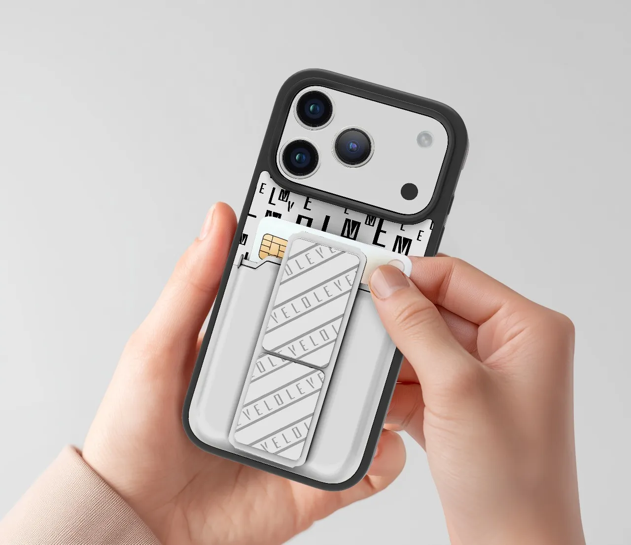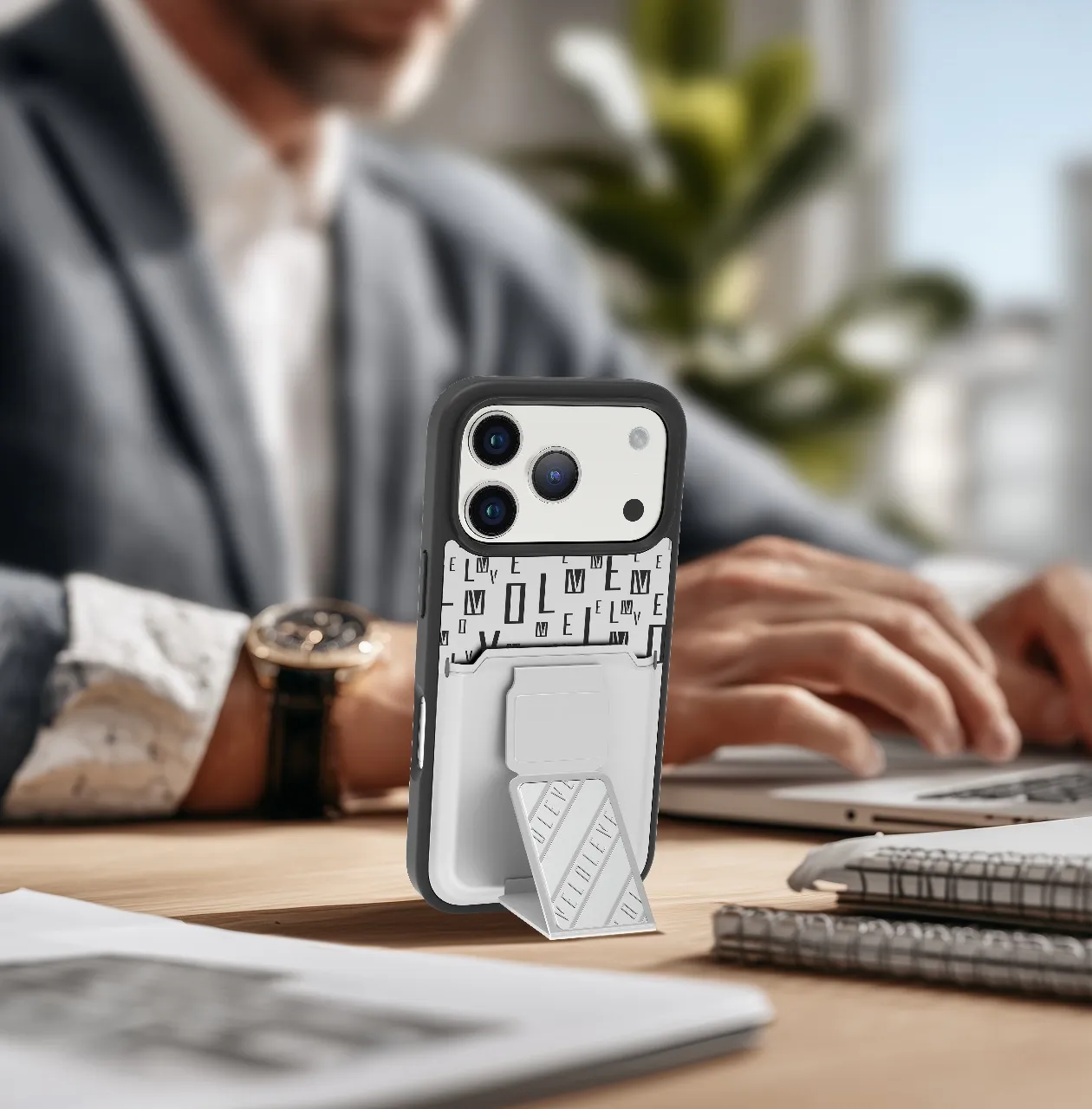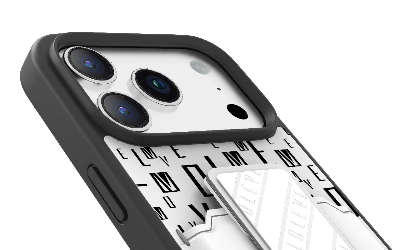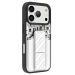 غطاء حماية ايفون17 بروماكس مع حاملة بطاقات وحزام مغناطيسي للتثبيت / قبضة بيد واحدةوغطاء خلفي بتصميم فاخر مع شعار مطبوع باللون الفضي ر.س99.00