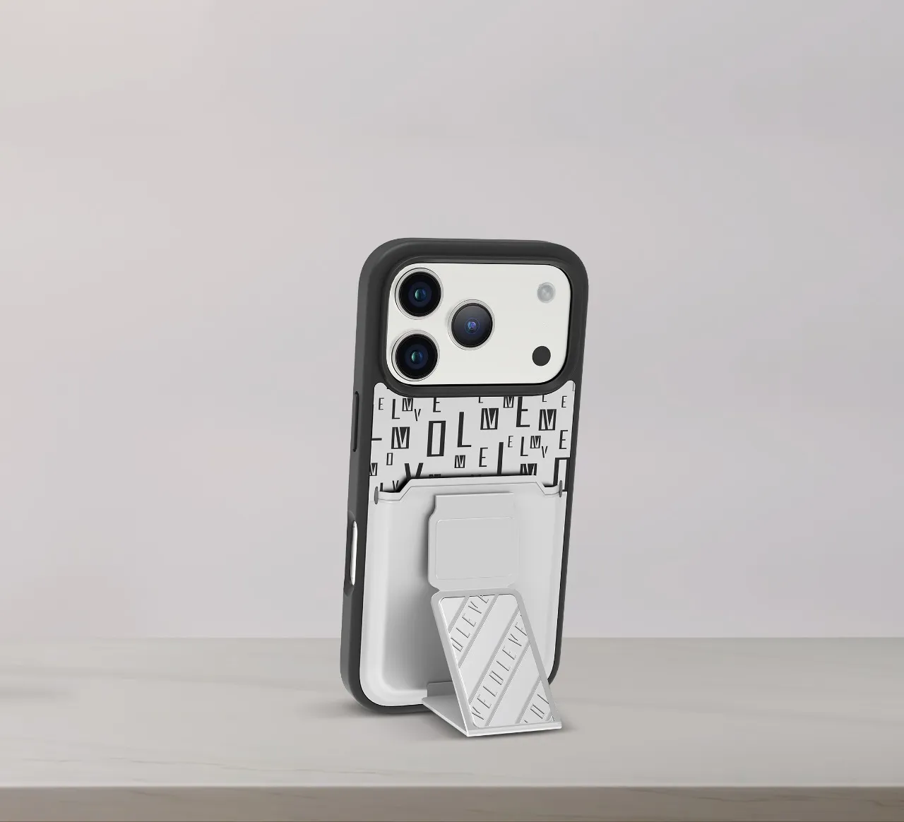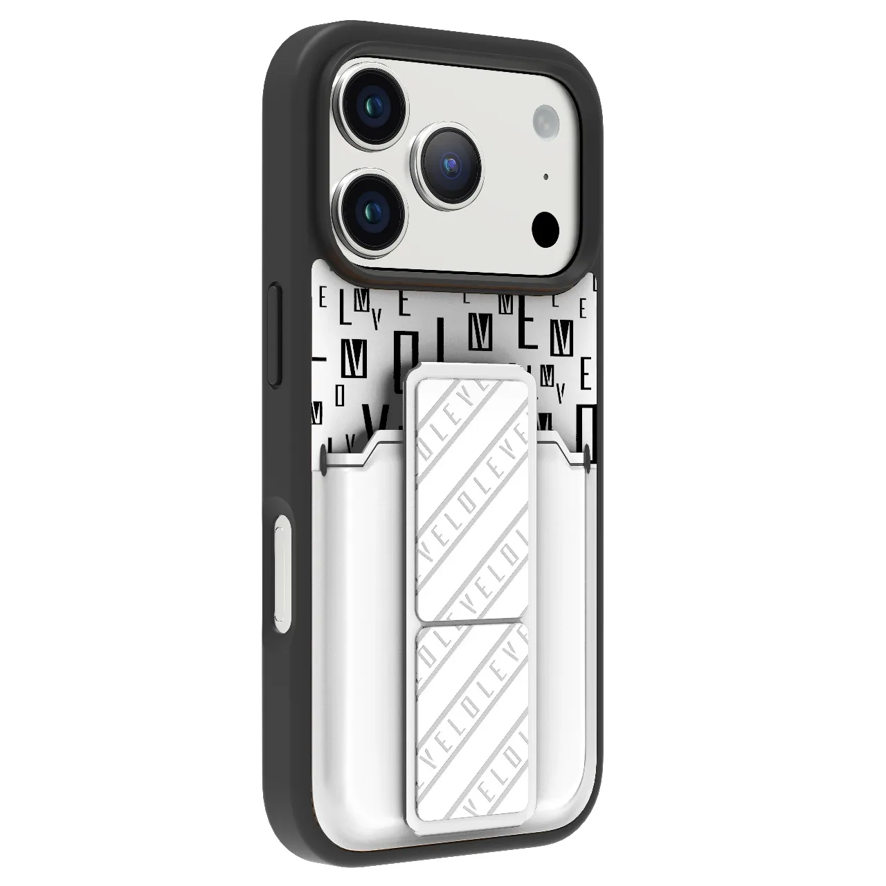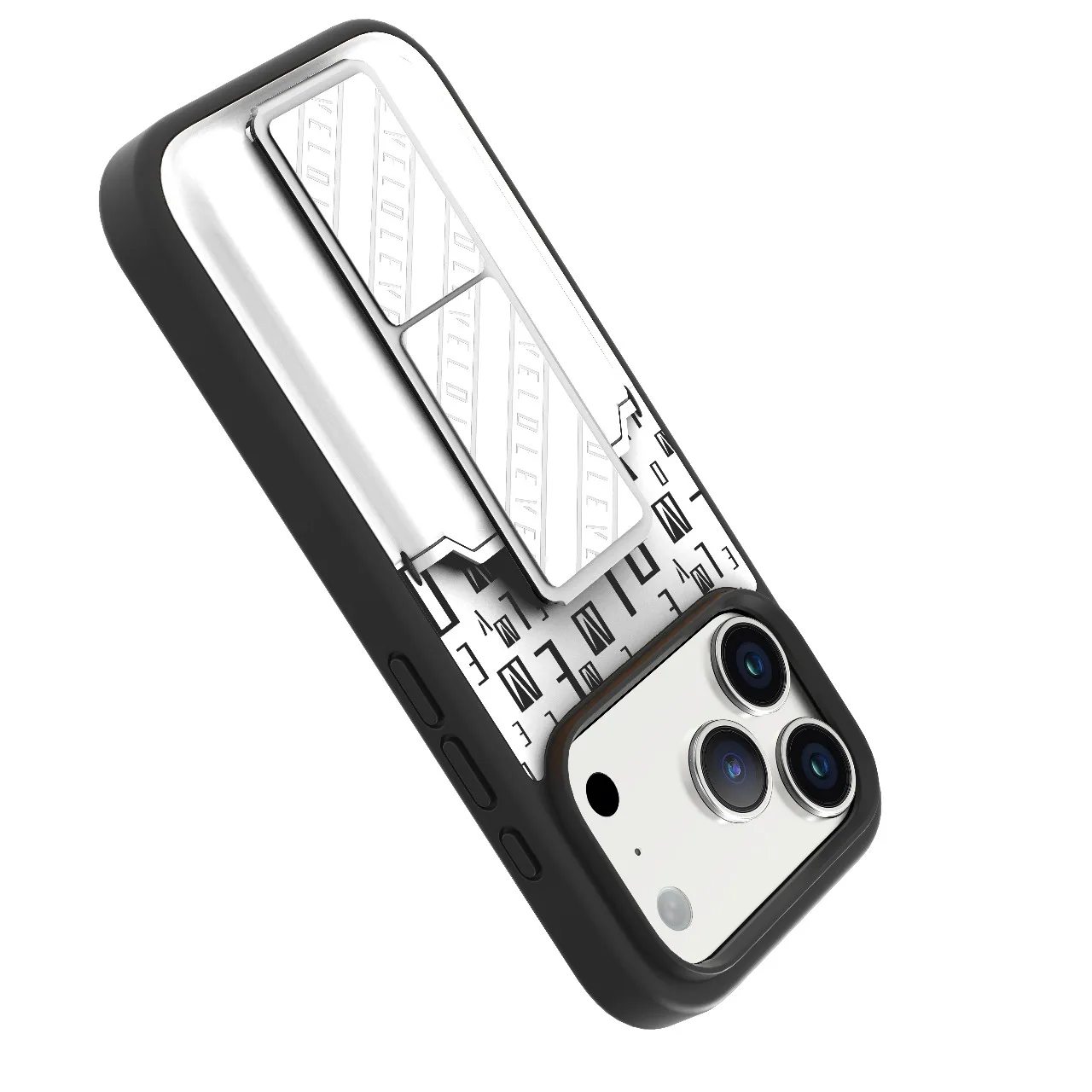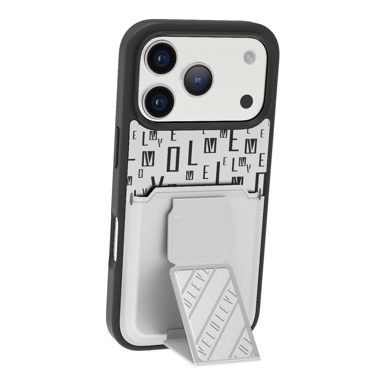 غطاء حماية ايفون17 بروماكس مع حاملة بطاقات وحزام مغناطيسي للتثبيت / قبضة بيد واحدةوغطاء خلفي بتصميم فاخر مع شعار مطبوع باللون الفضي