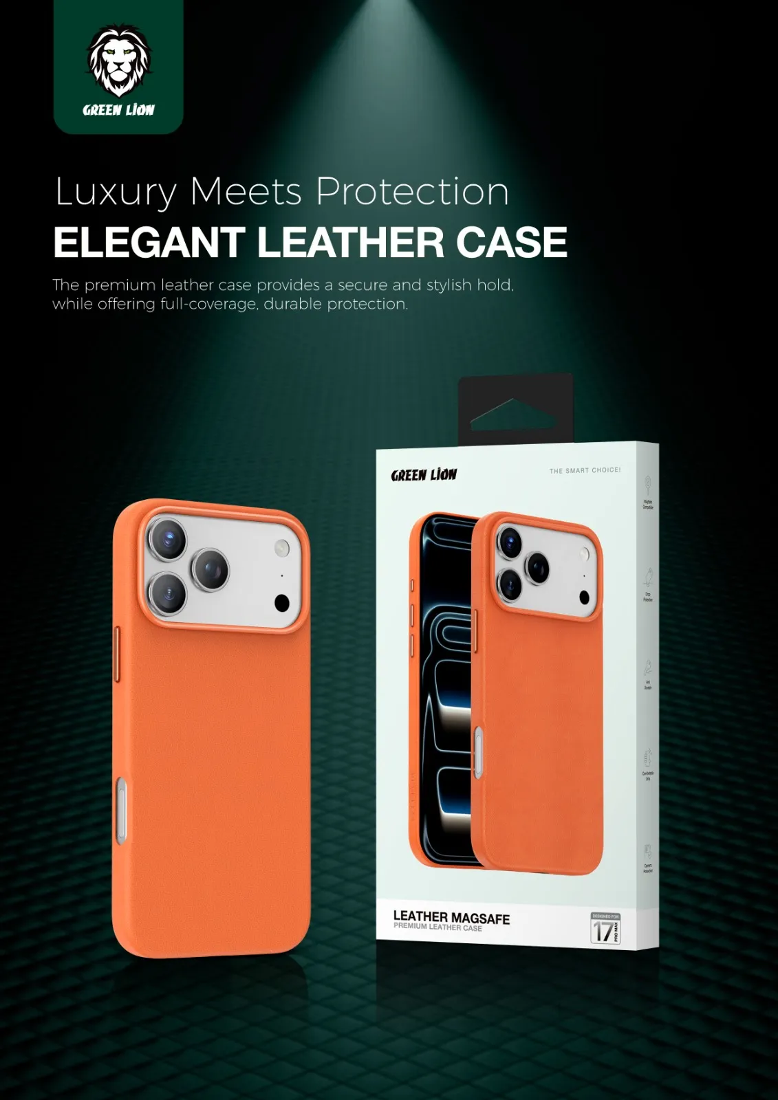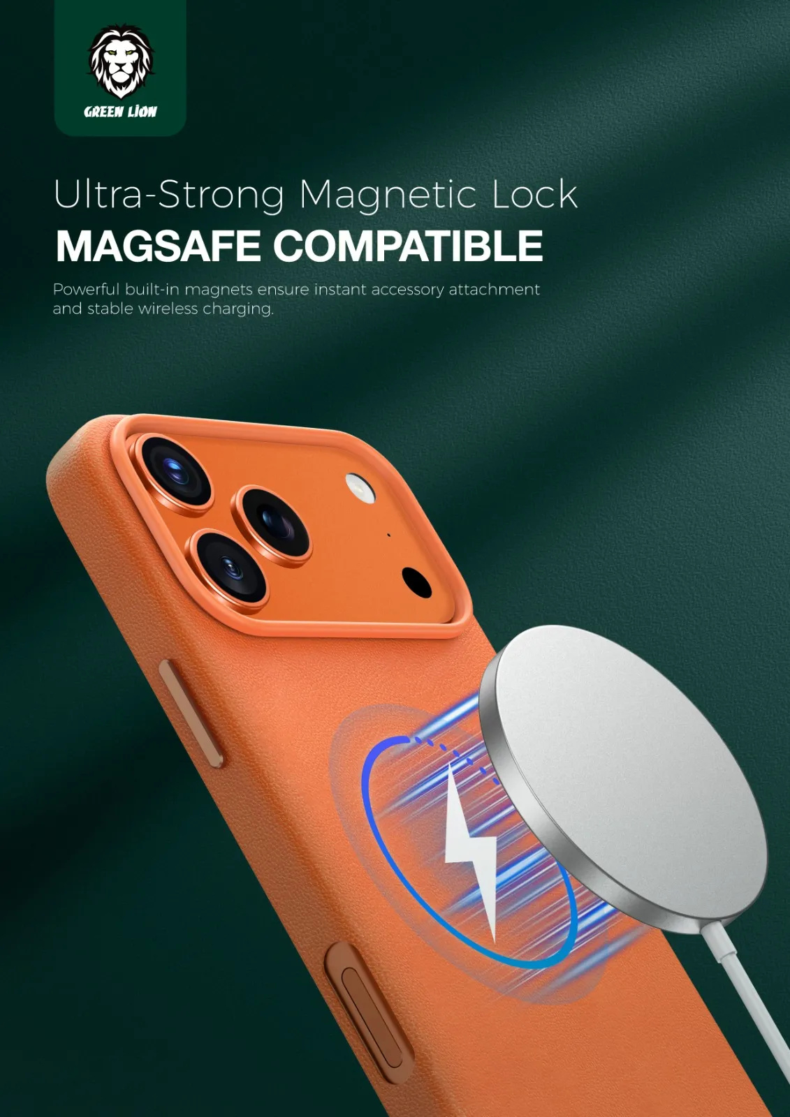 غطاء حماية لهاتف ايفون 17بروماكس Green Lion Leather MagSafe Case- برتقالي