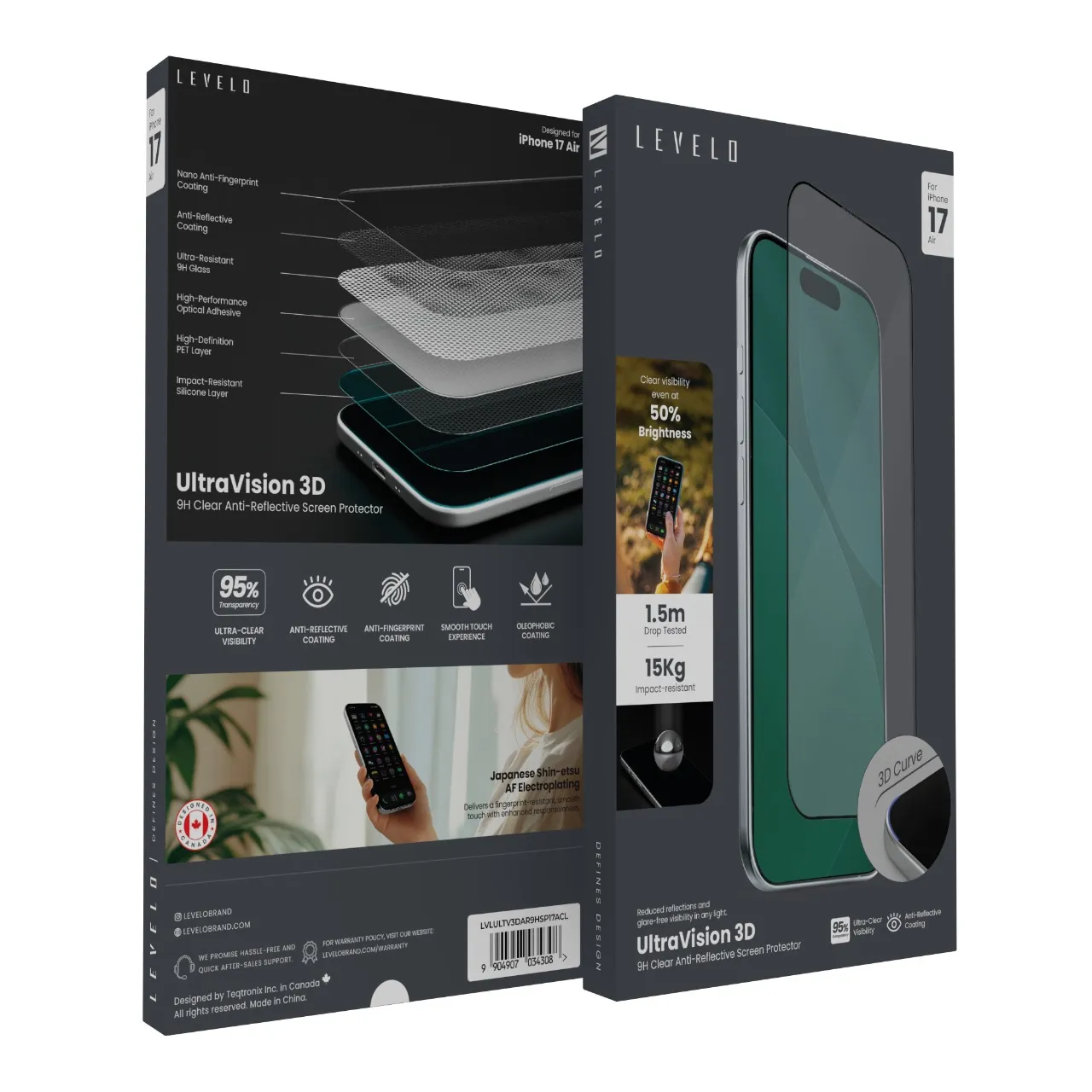 غطاء شاشة ليفيلو الترا فيجن ثلاثي الابعاد AR 9H لموبايل ايفون اير17 ، تم اختباره ضد السقوط، زجاج 9H فائق المقاومة، لاصق بصري عالي الاداء، حماية ضد الصدمات، مضاد لبصمات الاصابع – شفاف