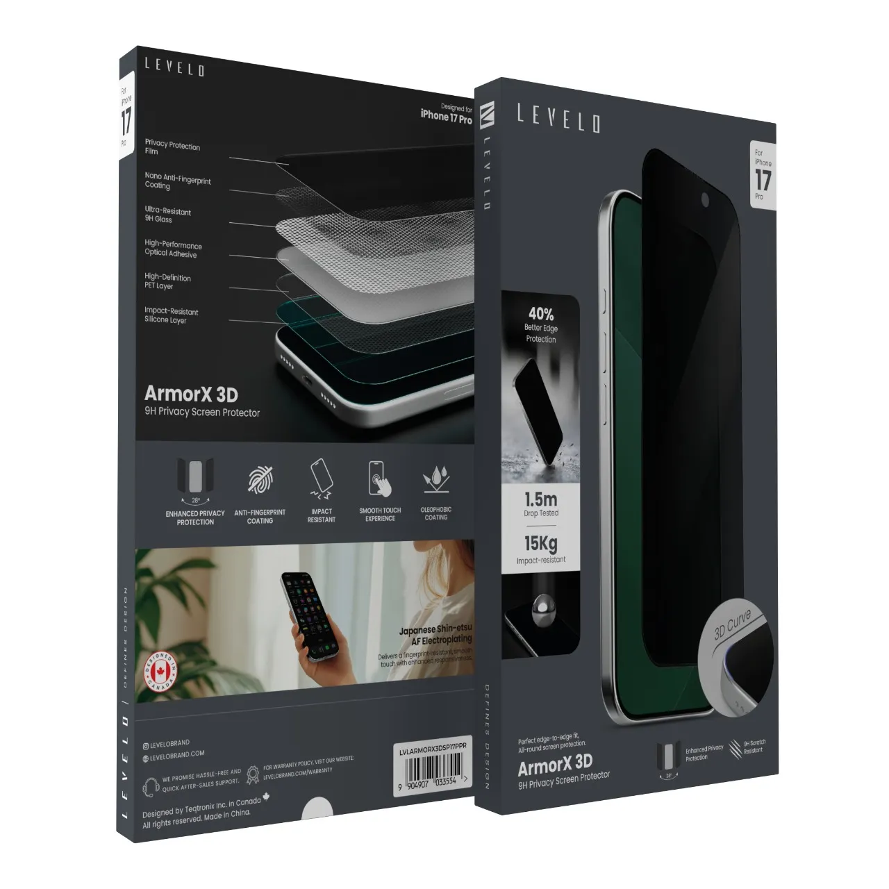 واقي شاشة للخصوصية ArmorX 3D لـ iPhone 17 Pro مع طبقة مقاومة 9H فائقة وطلاء مضاد للبصمات من النانو، طبقة أوليوفوبية، تجربة لمس ناعمة، حماية حواف أفضل بنسبة 40%، طبقة سيليكون مقاومة للصدمات– اسود