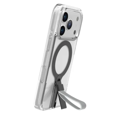 غطاء حماية لهاتف ايفون 17بروماكس شفاف مع حاملة معدنية دوارة باللون الفضي 360°