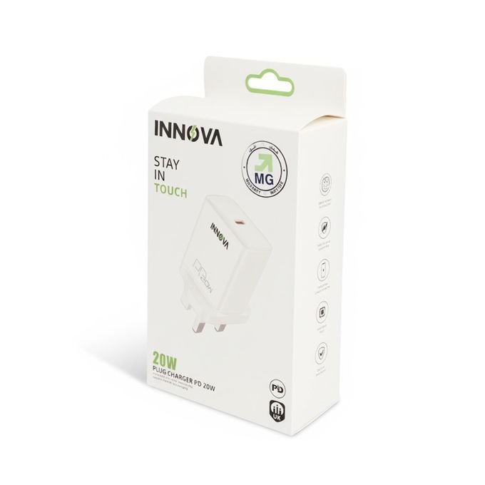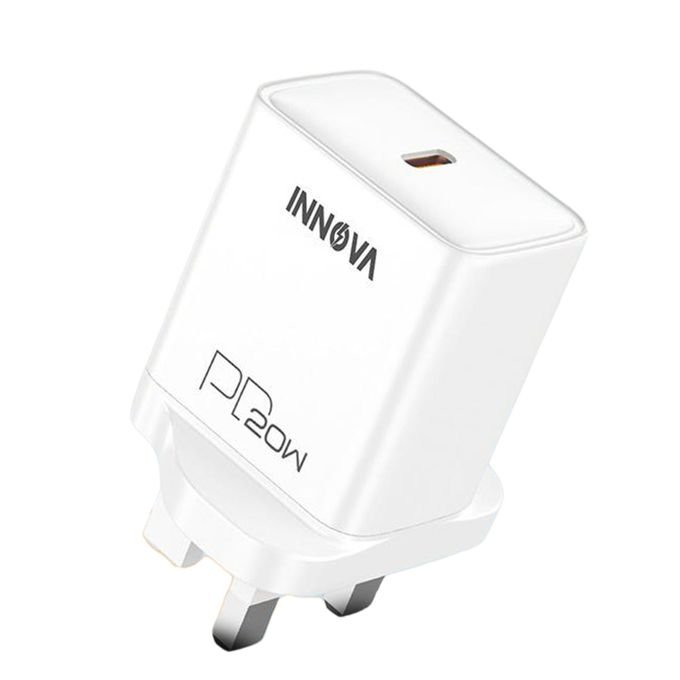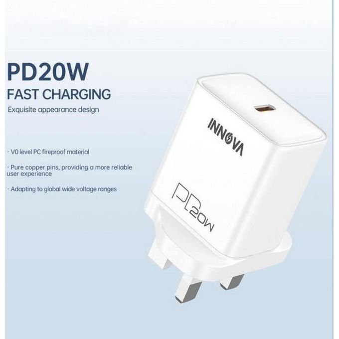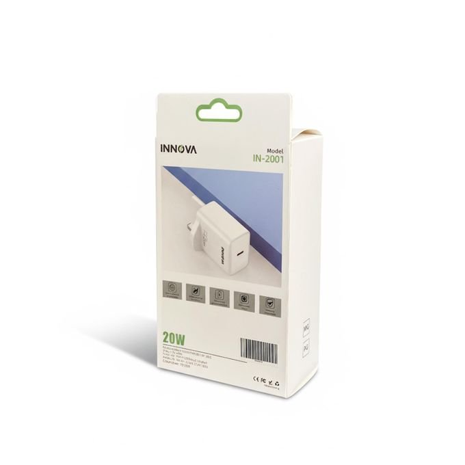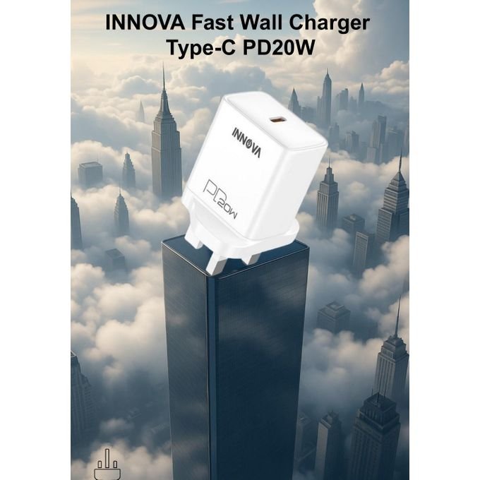 شاحن الحائط INNOVA Type-C بقدرة 20 واط مصمم لتوفير شحن سريع ومستقر لمختلف الأجهزة الذكية. يدعم تقنية Power  Delivery مع توزيع ذكي للطاقة لحماية بطارية الهاتف من الشحن الزائد أو السخونة، ويعمل على نطاق واسع من الفولتية مما يجعله مناسبًا للاستخدام اليومي.