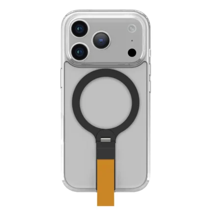 غطاء حماية لهاتف ايفون 17بروماكس شفاف مع حاملة معدنية دوارة باللون البرتقالي 360°